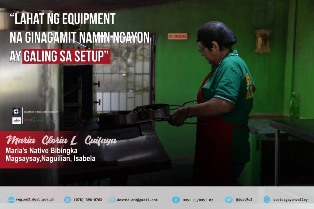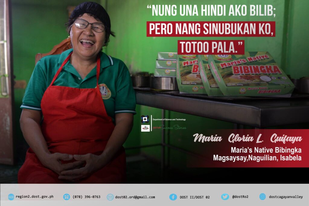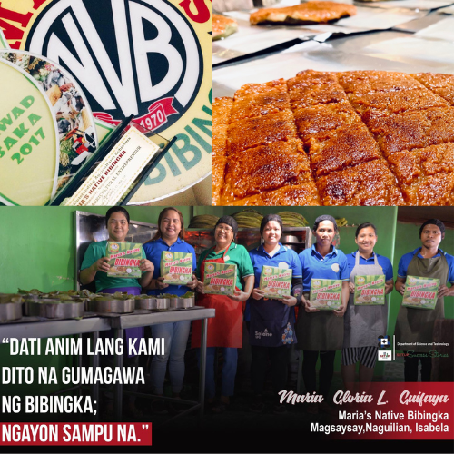 With the assistances of various government agencies like DOST, DTI, TESDA, DA, LGU and the private sectors, they  were able to improve their products, constructed modern building that housed their  production and display area, participated to various trade fairs, availed financial assistance from the DOST in 2010 amounting to Three Hundred Thousand (P300,000.00) payable for three years at zero interest rate which they used to upgrade their equipment, increase their production of Bibingka and hire more employees. To date, they are now the owner of Maria’s Bibingka  Pasalubong Center/ OneStore Hub selling various products coming  from her fellow MSMEs in Region 02.  Their minimum production of bibingka is around 100 pieces per day and their customers are increasing  not only within Region 02 but  as far as Manila and Cebu.